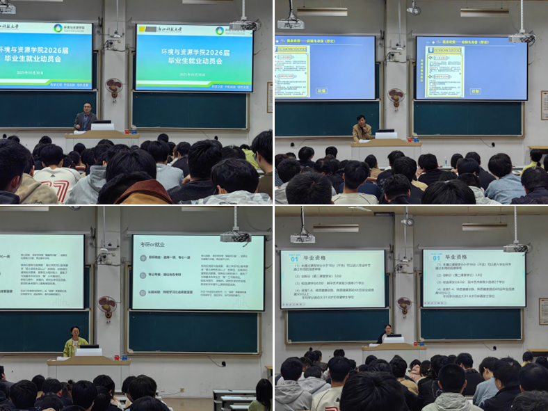 2025年10月30日下午,环资学院2026届毕业生就业动员大会在A3-125顺利举行。学院党委书记李俊、党委副书记王群、校招生就业办公室就业导师俞广良,各系负责人、毕业生班主任、学工办、研工办、教务办相关老师,以及2026届全体毕业生参会。大会由党委副书记王群主持。