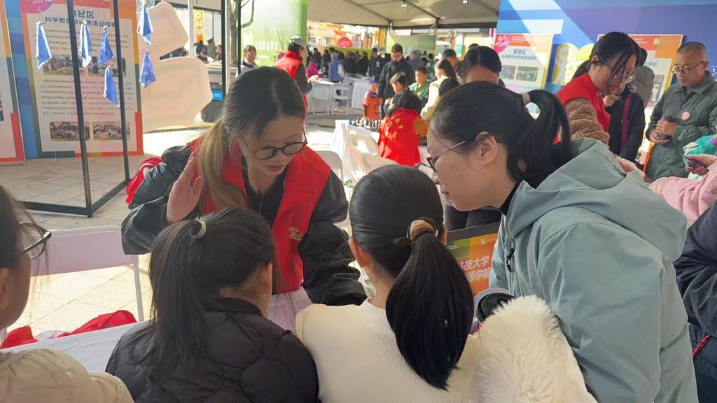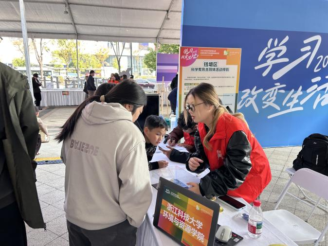 2025年11月22日,萧山区户外广场热闹非凡,2025年杭州市全民终身学习活动周成果展示在此隆重举行。浙江科技大学环境与资源学院受邀参展,开展绿色低碳科普宣传,现场演示自制的空气净化器,并生动讲解其工作原理,吸引了众多市民、学生和社区代表驻足互动。